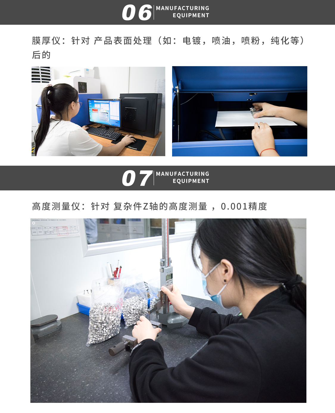 公司設備優勢:配備自動化生產機器設備、壓鑄機配有ABB機器人,CCD檢測設備,二次元,三次元,2.5次元,膜厚儀等檢測設備,以及鹽霧測試機。